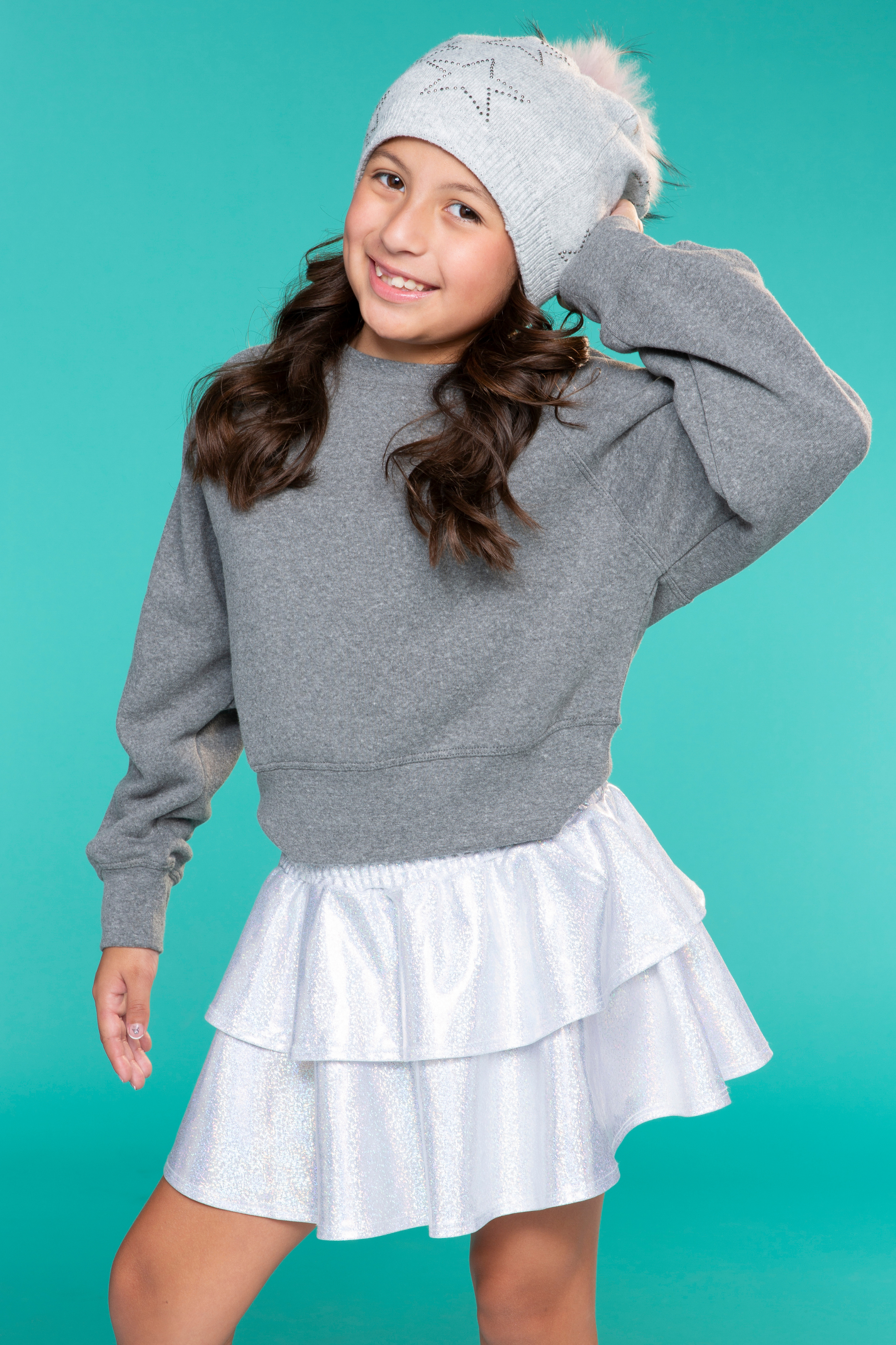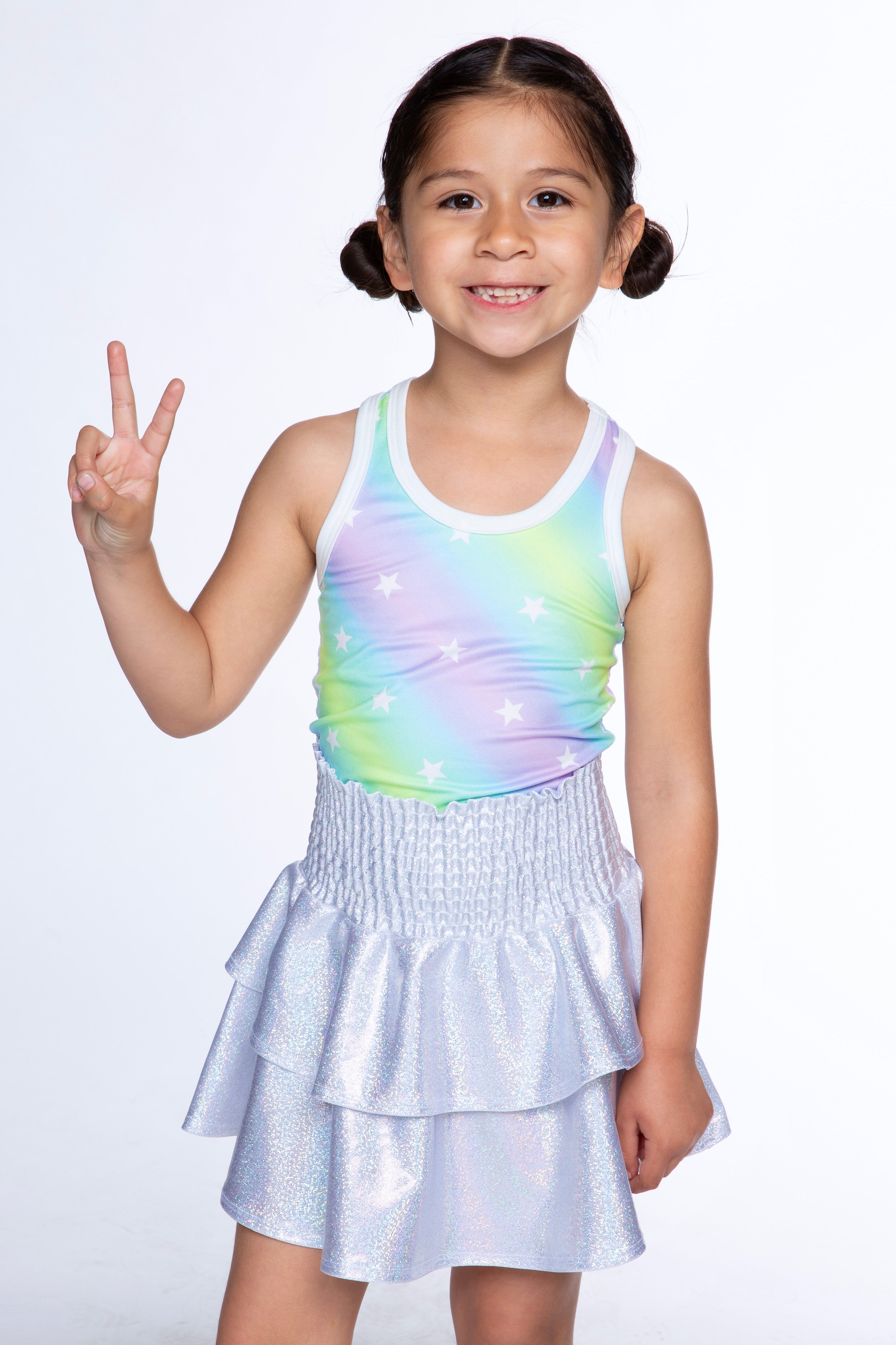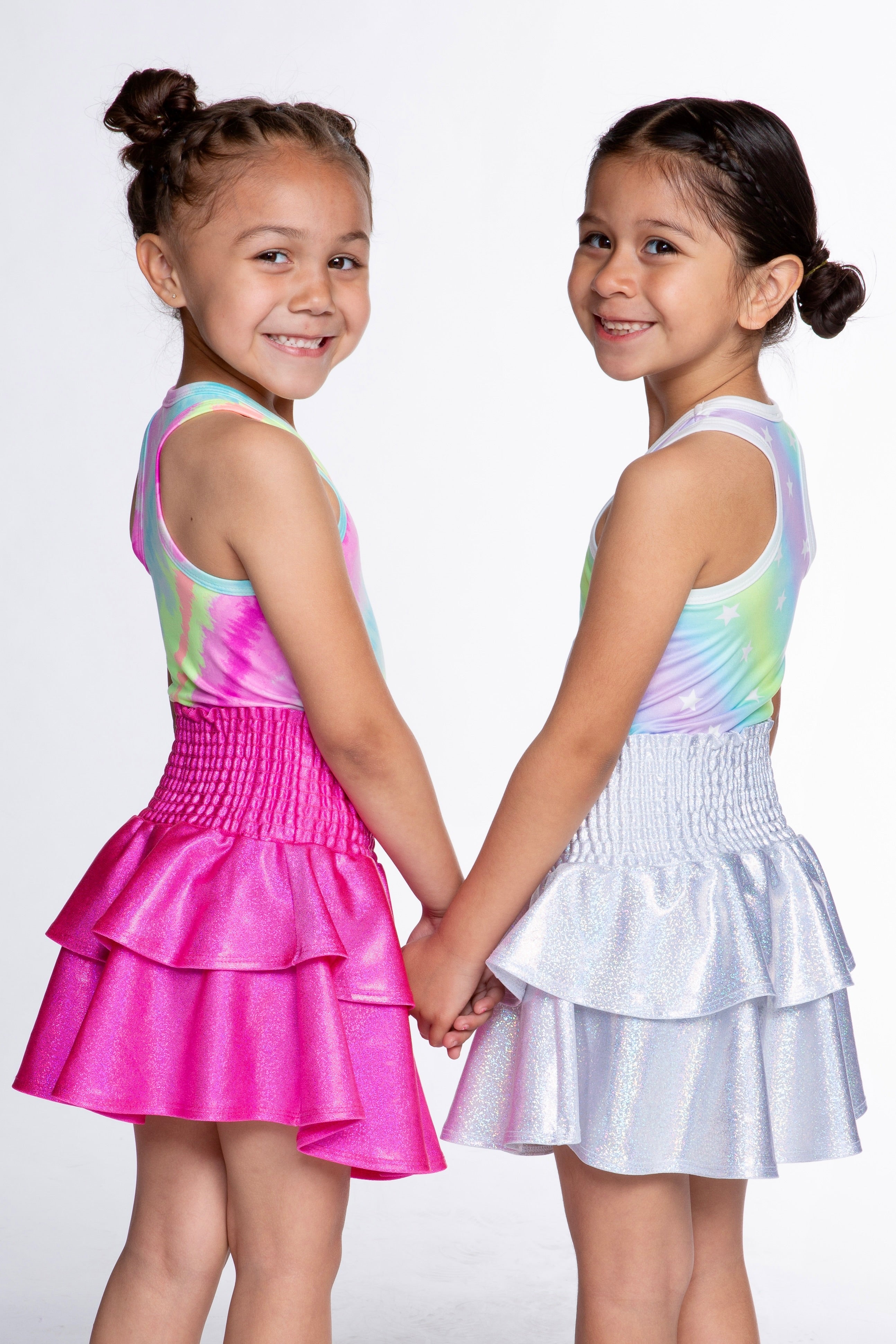 This style features a smocked waistband, two tiers of ruffles. This style features our shiny, glitter-looking, ultra-stretchy fabric quality. It's the perfect mix of feminine & edgy!